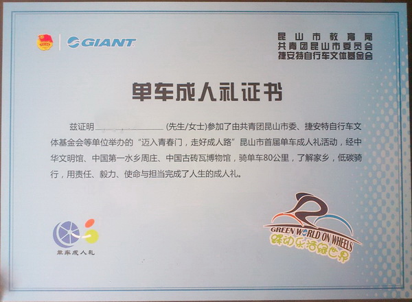 早上8点,在举行了庄严的成人宣誓仪式后,近90名青年学子骑上单车,从第一职业中学出发,途经张浦、周庄、锦溪等镇区,并参观了中华文明馆、中国第一水乡周庄和中国古砖瓦博物馆。一路上大家欢歌笑语,你追我赶,在快乐的氛围中低碳骑行80公里。同学们凭借自己的耐力、毅力和信心,完成了一次漂亮的单车之旅。下午16点30分,大家顺利到达目的地——昆山党校,随后参加了在党校时代宾馆举行的庆功宴,并获得了“单车成人礼证书”。此次活动,同学们收获的不仅是一本证书,更是在自己的人生道路上绘出了精彩的一笔,留下了美好的回忆!