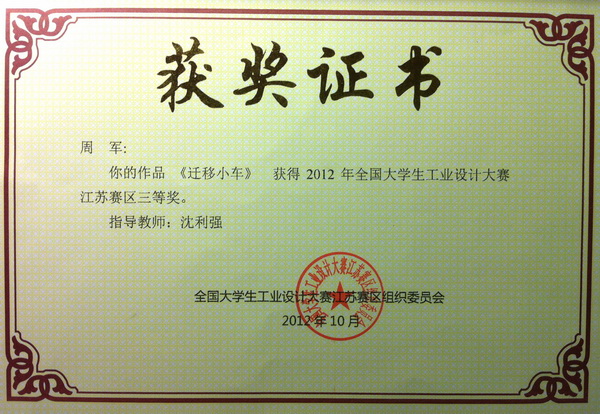 我院选送的机电工程系数控技术专业10-1班周军同学《迁移小车》作品,经过全国工业设计大赛江苏赛区评委组的严格审评,已荣获2012年全国大学生工业设计大赛江苏赛区三等奖,我院是江苏省唯一一所获此殊荣的民办专科院校。