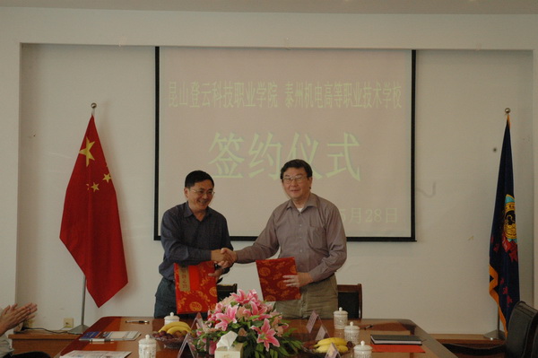 徐忠院长对孙晓龙副局长一行的到来表示热烈欢迎,他介绍了学院创建历程、学科设置、人才培养和工学结合专班建设等情况,并对泰州市教育局一直以来对学院发展的关心和支持表示感谢。他在讲话中谈到,学院“工学结合专班,校校企合作”人才培养模式以促成校企全面深度合作,在实践中培养高端技能型人才为特色,充分体现了职业教育重实践技能和工作能力培养的理念,非常欢迎泰州的学生来到工学结合专班学习。孙晓龙副局长说,登云学院职业教育改革工作取得了有目共睹的成绩,在江苏省职业教育领域内的影响力不断增强,他对此表示十分的赞赏。并表示,泰州市教育局将一如既往地支持学院的人才培养工作。孟华锋副校长介绍了泰州机电高等职业技术学校的发展情况。双方就开展教师交流、学生互访等合作进行了深入洽谈,并在友好氛围中签订了合作协议。双方希望今后进一步密切交流与合作,共同为江苏省职业教育发展和技能型人才培养做出贡献。