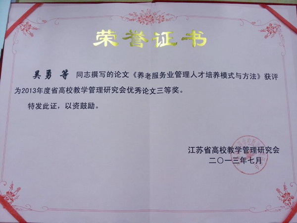 日前,我院老年服务与管理专业教研室教师孙海英、林文兄、韩品嵋、吴勇等撰写的教学论文《养老服务业管理人才培养模式与方法》,获评2013年度江苏省高校教学管理研究会优秀论文三等奖。