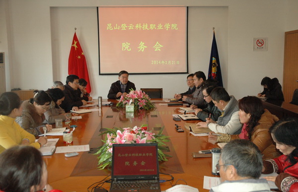 徐忠院长首先传达了江苏省教育厅组织召开的全省教育改革推进会、全省教育工作会等会议中主要有关高职教育的精神。一、进一步认识职业教育的定位和改革任务;二、在职业教育教学改革中逐步建立以能力为取向的实践教育教学模式,完善实践育人机制,使学生更好地融入社会;三、支持发展民办教育,将非盈利性民办学校与公办学校同等对待。随后,徐忠院长对本学期的工作作了全面部署。一、推进目标管理,深化教育教学改革。二、围绕工学结合专班教改项目结题,深化人才培养模式改革,抓目标、抓落实、抓责任、抓成果,确保完成各项改革任务。三、加强实训基地建设,确保实训基地充分发挥学生技能培养、促进师资水平提高、服务社会经济发展等功能。四、做好各项准备工作以充分的信心迎接新一轮评建。五、进一步完善内部管理制度。六、深入开展党的群众路线教育实践活动,加强学习型、服务型、创新型党组织建设。