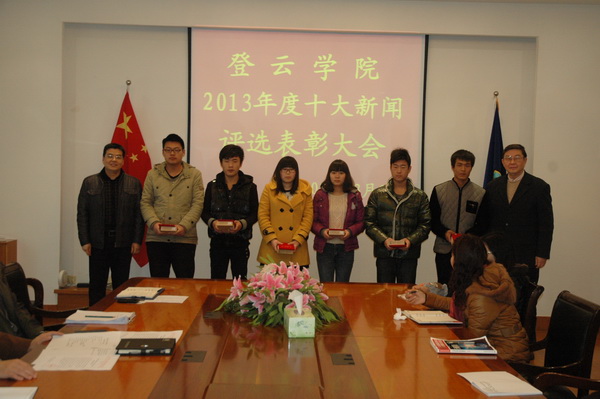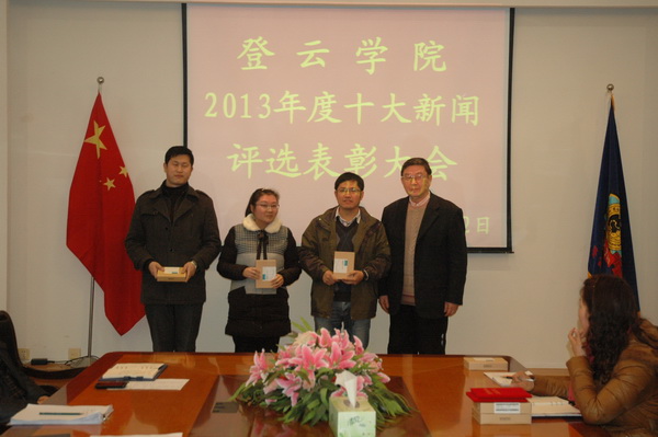 徐伟副院长首先宣读了《关于表彰“登云学院2013年度十大新闻”评选活动获奖者和新闻作者的决定》。按照《决定》精神,对在评选活动中表现突出的机电工程系教师朱爱梅、信息技术系计算机网络应用12-1班学生王巧圆等10名师生,及“十大新闻”的作者陈润等7人予以表彰奖励。另外,会议还对《登云学院报》的8名编辑进行了表彰。在愉快的氛围中,徐忠院长、徐伟副院长分别为获奖师生颁发了荣誉证书和奖品,并合影留念。