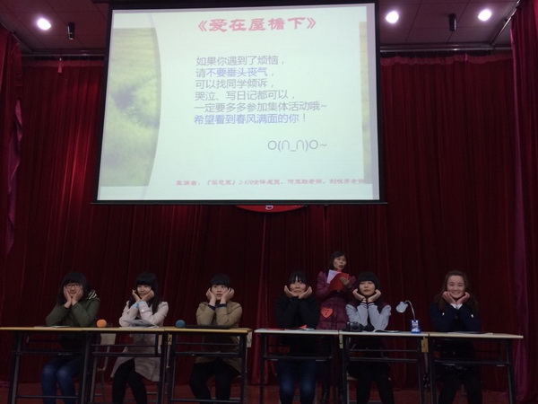 信息系抽选到的表演内容分为两部分,一部分为不良情绪“垂头丧气”的演绎,另一部分为积极情绪“春风满面”的演绎,要求自定情景。此次参赛的学生演员全部来自2-420宿舍,节目主题为《爱在屋檐下》,描述的是女生宿舍发生的矛盾事件:一位女生性格孤傲,无法融入集体生活,后通过敞开心扉与他人交流解开误会,营造了幸福和谐的宿舍氛围。同学们的表演真实生动,反映了大学生集体生活中感人的一面。学生汤春鹏在表演中更是声泪俱下,真情实感的流露让人无不为之感动。指导教师刘咏芳、何玉勤从人员的筛选到剧情的控制,以及每一次的练习都用心斟酌、不断改进。两位老师也积极参与到表演中,何玉勤老师最后一段的温情表演,让同学们明白了处理此类心理问题的有效方法。节目引起现场观众内心的震撼和启示,师生共同创作、表演的过程也是一次心灵的交流融合和情感的洗涤。