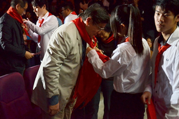 最后的“感恩与思念”篇章中,周晓东等同学带来的歌舞剧《童年》将大家带入到美好的童年记忆中,伴着熟悉的旋律,台上出现了童年时光中跳绳、画画、玩竹蜻蜓的场景,同学们还给所有老师重新戴上了红领巾,重温当年的快乐。紧接着焦家阳等人带来的手语操《跪羊图》,以羔羊跪哺呼吁所有同学要知恩图报,感谢给予我们生命、让我们拥有快乐的父母。宋亚楠、山仑带来的朗诵《妈妈的礼物》再次将感恩的范围从父母转向老师,如泣如诉的声音让不少在场的观众感动落泪。最后信息系学生会还精心准备了一段视频献给所有的老师,在《感恩的心》伴奏下,播放不同班级、不同年级的学生最想对老师说的话,表达对老师崇高敬意和深切感激。晚会在一首《young for you》中依依落下帷幕。