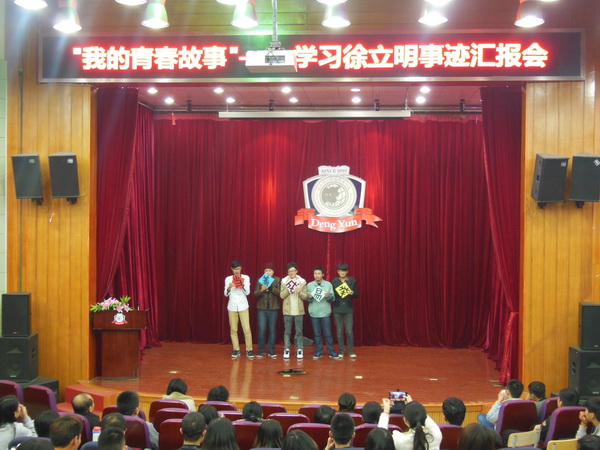 李源泉首先以视频的形式与在场的师生回顾了学习徐立明活动详细过程。各系也以多种的形式汇报了学习成果:商管系以小品《一场特殊的班会》来抨击社会道德中的不良现象;以诗歌朗诵来赞扬徐立明英勇救人的壮举;以舞蹈表演来重现救火感人现场;以优美的歌曲唱响正义的力量。建艺系以朗诵、合唱结合的独特方式演绎了《英雄赞歌》,表达了对本系出现救火英雄的骄傲之情。汽车系的访谈节目——《奔驰夜话》汇报了三位学生学习徐立明的心得体会。他们表示要将所知所学落实到行动中,每天改变一点点,每天进步一点点。同时,汽车系借学习英雄的时机,掀起了“学风、班风、舍风”三大整风运动,使同学们学习面貌焕然一新,更具活力。信息系的《当善成易举,温暖你我》阐明了“善行是举手之劳,行善可感动他人温暖社会”的道理;用朗诵表达学习徐立明同学的感想,用歌曲来表明提升个人思想认识、不断锻炼成长的决心。机电系李新斌老师为同学们开展一堂别开生面的《赞登云骄子,唱青春之歌》主题班会。班会回顾了学习徐立明的过程,凸显了系部“博雅人才”培训班在“强学风、促成长”的榜样作用。诗歌朗诵《少年中国说》,呈现出了青年特有的蓬勃朝气,激励在场所有青年以积极进取的姿态去追寻中国梦。