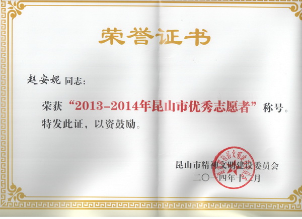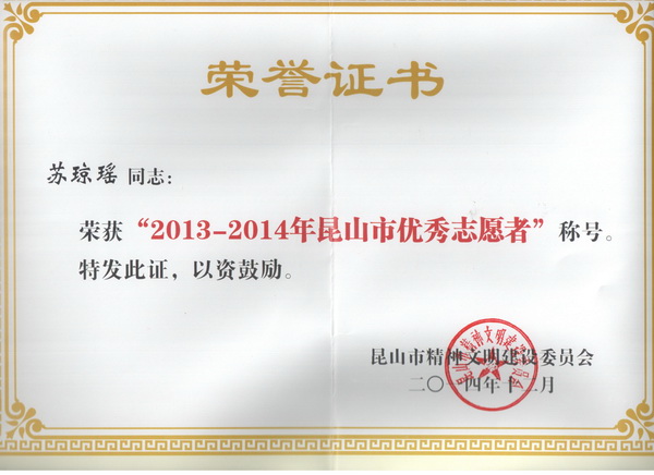 为进一步弘扬志愿服务精神,发挥先进典型的示范引领作用,不断提升全市志愿服务水平,昆山市精神文明建设委员会近日在全市开展2013-2014年度昆山市优秀志愿者、优秀志愿服务团队及志愿服务工作先进单位、个人评选活动。我院青年志愿者协会被评为“2013-2014年昆山市优秀志愿者服务团队”;苏琼瑶、赵安妮两位同志被评为“2013-2014年昆山市优秀志愿者”。