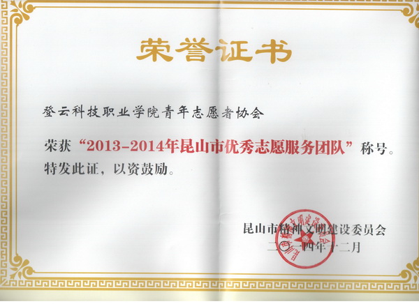 我院青年志愿者协会创建于2007年,是一支由志愿从事社会公益事业的登云学子组成的团体组织。协会以“奉献、友爱、互助、进步”为宗旨,为学院发展、助困助学、社会公益以及大型活动从事志愿服务工作。近年来,在协会全体成员的积极努力下,活动内容不断丰富,志愿服务影响力不断提升,大家的志愿服务意识显著增强,校内外志愿服务氛围进一步浓厚。协会先后荣获2009-2010年度“昆山市志愿者服务先进集体”、2013-2014年度“昆山市优秀志愿服务团队”、2013-2014学年“登云金牌社团”等荣誉称号,并得到我院师生和昆山市民的一致好评。