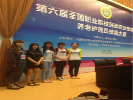 我院老年服务与管理专业选派12级的魏佳、邹园园,13级的王桂彩,14级的宋怡莹、邓超男等五名学生参加比赛。此次比赛中技能考核采用个人技能操作和团队职业能力展示的方式进行综合评分。我院在团队职业能力展示环节以自创的“大脑有氧操”获得了评委老师的一致肯定。在“协助偏瘫老人进食”、“使用热水袋为老人取暖”、“为卧床老人翻身预防压疮”等个人技能操作项目中,我院选手操作严谨细致,表现出娴熟的业务技能。经过三天紧张激烈的角逐,我院魏佳同学获得二等奖,邹园园、王桂彩、宋怡莹、邓超男同学获得三等奖,我院代表队获得优秀组织奖。