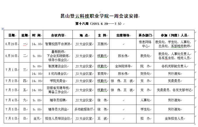 学院第十八周(2015.6.29—7.5)会议安排