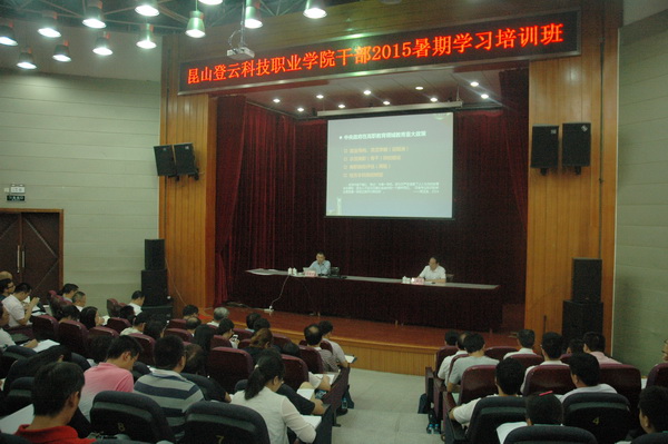 8月30日下午,在我院2015年暑期干部学习培训班上,江苏省教育厅高教处处长袁靖宇博士为与会人员作《高等教育“十三五”发展面临的重大挑战和应对》专题报告。李先立执行董事,郑家泰荣誉院长,全体院领导,机关中层干部、处长助理,各党支部书记,各系部主任、副主任、主任助理、教研室主任,全体行政干部、教师、辅导员共同聆听了报告。报告会由钱勤元院长主持。