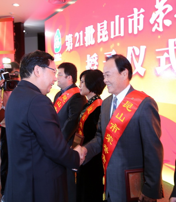 10月17日上午,昆山市第21批“荣誉市民”表彰活动在市级机关大楼多功能厅隆重举行。我院林赐农董事长荣获“荣誉市民”称号。苏州市副市长、昆山市委书记徐惠民为林赐农董事长佩戴了“昆山市荣誉市民”绶带,昆山市委副书记、市人民政府市长杜小刚为林赐农董事长颁发了“昆山市荣誉市民”铭牌。