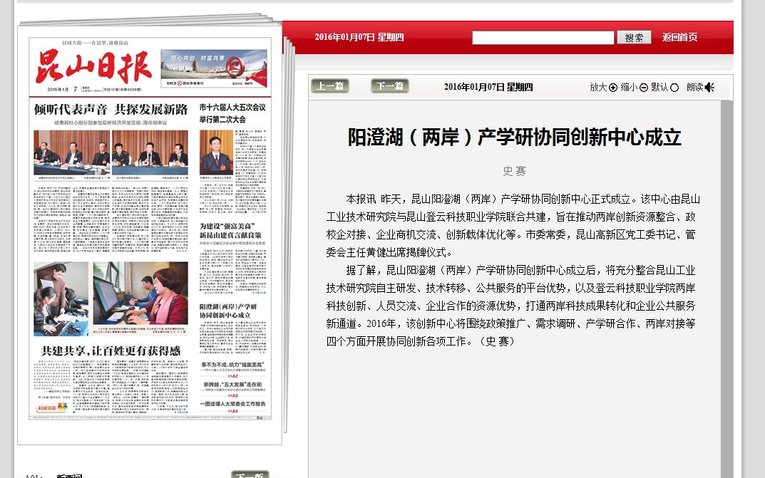 据了解,昆山阳澄湖(两岸)产学研协同创新中心成立后,将充分整合昆山工业技术研究院自主研发、技术转移、公共服务的平台优势,以及登云科技职业学院两岸科技创新、人员交流、企业合作的资源优势,打通两岸科技成果转化和企业公共服务新通道。2016年,该创新中心将围绕政策推广、需求调研、产学研合作、两岸对接等四个方面开展协同创新各项工作。