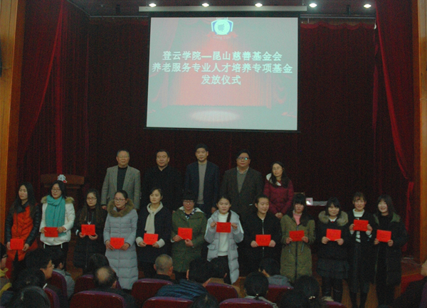 1月8日下午,登云学院—昆山慈善基金会养老服务专业人才培养专项基金发放仪式在我院多功能报告厅举行。昆山民政局党委陈慰国委员、民政局社会福利和慈善事业科钱瑛科长,我院王振州常务副院长、王波副院长出席活动。商务管理系老师、辅导员及学生代表等200余人参加了仪式。仪式由商管系李岚主任主持。
