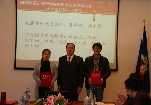 钱勤元院长首先致辞,对培训中心2015年度各项工作取得的成绩给予肯定,并鼓励获奖教师再接再厉,充分发挥主观能动性,争创更好的成绩。随后举行了颁奖仪式,林赐农董事长为汽车工程系、商务管理系颁发了优秀系部奖,钱勤元院长为桂美庆、陈润、张宝如、秦明伟等十余位获奖教师颁发了个人奖项。