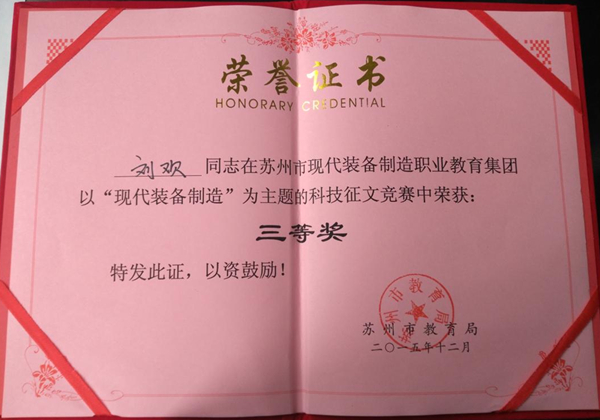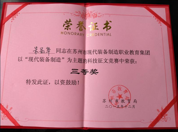 4月1日下午,苏州市现代装备制造职业教育集团2016年年会暨苏州市首届科技学术征文比赛获奖表彰大会在苏州市职业大学举行。我院教务处副处长罗瑜、培训中心副主任张宝如作为理事单位代表应邀参加了会议。大会对征文比赛获奖人员和单位进行了表彰,我院机电系朱圣华、刘欢两位老师分获三等奖。