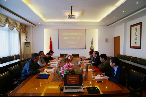 4月14日上午,硅湖职业技术学院党委书记顾定红等一行4人访问我院,学院院长党委书记钱勤元热情接待了来访贵宾,副院长党委副书记徐伟、院办党办主任任启全等陪同接待。