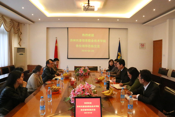 4月14日上午,苏州托普信息职业技术学院院长助理朱滨、现代技术学院院长陈壁等一行6人莅校考察交流,机电系主任黄志辉、副主任朱爱梅等热情接待了来访嘉宾。