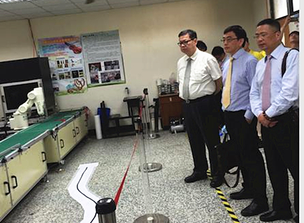 随后,在明新科技大学领导陪同下,与会嘉宾参观了智能机器人研究室、五轴加工中心、FMS等重点实训实验室。双方约定,5月底对昆山高新区某重点企业在金属导电在线自动化检测方面进行企业诊断合作。