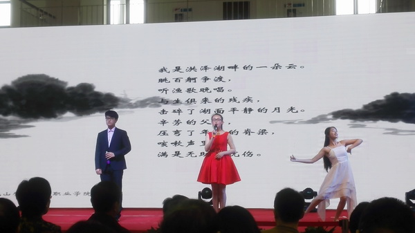 开幕式上,我院学生王梓橦、刘飞、张静雯深情朗诵诗歌《云的翅膀》,以饱满的激情、动人的语言和优美的舞蹈,讲述了工学结合专班学生葛云面对生活的磨难,始终以积极乐观的心态,坚定不移的毅力,向着远大理想不懈奋斗的故事,赢得台下观众热烈的掌声。