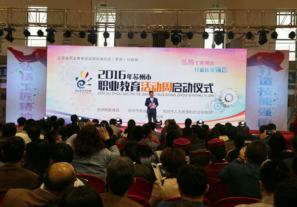 5月13日下午,苏州职业教育活动周总开幕式暨学校办学成果展在苏州工业园区工业技术学校举行,41所中高职院校设立参观展位。苏州市副市长徐美健出席活动并致辞。我院徐伟副院长、纬创资通(昆山)有限公司招募主管周丽娟参加开幕式。我院参加办学成果展览,并在开幕式上表演诗歌朗诵《云的翅膀》。