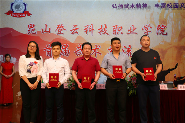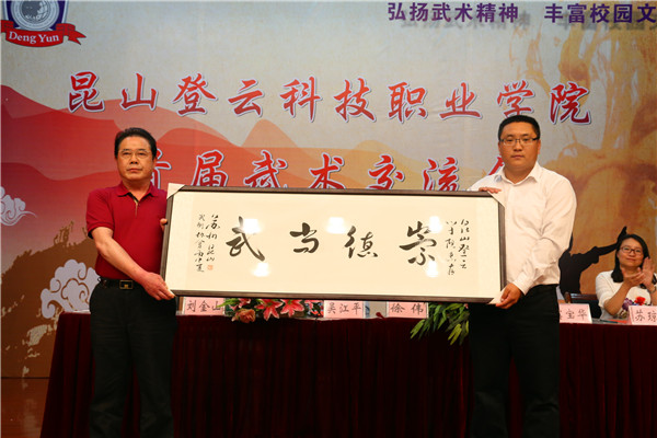 团委苏琼瑶书记为苏州市武术协会刘金山主席、昆山市武术协会窦保华主席、昆山市拳武馆李杉馆长、昆山苍轩跆拳道馆叶平馆长颁发了我院武术协会名誉教练聘书,昆山市武术协会、拳武馆、苍轩跆拳道分别向我院武术社、散打社、跆拳道社等社团授予会员单位牌匾并捐赠了训练器材。刘金山主席致赠我院武术协会“崇德尚武”题字并致辞,对登云学院武术协会成为昆山市武术协会会员单位表示欢迎,并希望苏州市、昆山市武术协会今后加强与登云武术协会的交流互动,为广大校园武术爱好者提供一个交流平台,共同携手为中华武术文化发扬光大作出贡献。
