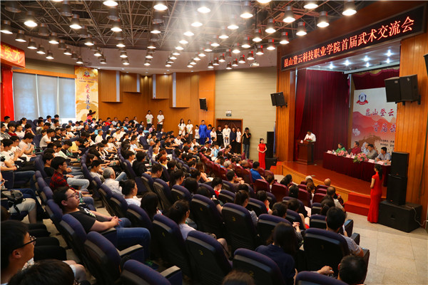 5月25日下午,由我院团委主办,苏州市武术协会、昆山市武术协会协办,学生社团联合会承办的“弘扬武术精神•丰富校园文化”——我院首届武术交流会在多功能报告厅举行。昆山市体育局副局长吴江平,苏州武术协会主席刘金山,昆山市武术协会主席窦保华,院党委副书记、副院长徐伟,学生处处长武凤鸣,团委书记苏琼瑶出席会议,三百多位校内外武术爱好者参加了交流会,交流会由学院武术协会主席刘成银老师主持。昆山电视台对本届交流会进行了跟踪报道。
