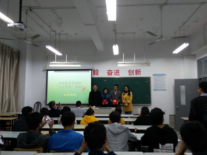 见面会由信息系党支部苏琼瑶书记主持,信息系梁明主任介绍“人生导师”的实施意义,对2016级新同学学业发展、就业前景、人生规划上提出具体要求和美好祝愿,随后梁主任宣读聘书并为教师颁发聘书。见面会最后各班人生导师与班级学生深入交流、座谈,教师从学习现状分析、专业行业前景、规划学习、规划人生等方面现身说法,学生积极参与、踊跃发言。整个见面会共持续一个半小时。