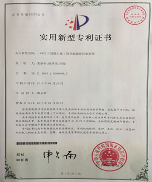 2016年11月,建艺系成功取得“一种用于混凝土施工的节能减排控制系统” 实用新型专利证书。