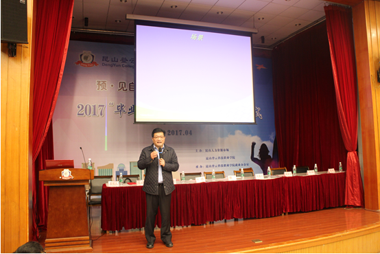 钱勤元院长首先代表学院党政领导班子对昆山人力资源市场领导、企业就创业讲师团代表的到来表示热烈欢迎。他介绍了学院近年来在深化教育教学改革中取得的成绩,以及为服务区域经济发展做出的积极贡献。他表示,学院将以省级示范性院校建设为主线,坚持以内涵发展为主,坚定不移地走以创新为指导的职业学院发展道路,坚定不移地走与区域经济建设和社会发展相结合的发展道路,坚定不移地走“工学结合、产教融合”迈向现代学徒制的多元化人才培养模式之路,以切实提高毕业生的就业质量为目标,实现毕业生充分且高质量就业、创业,为昆山经济发展输送更多高技能人才,并勉励同学们在昆山这片热土生根、发芽,结出硕果!