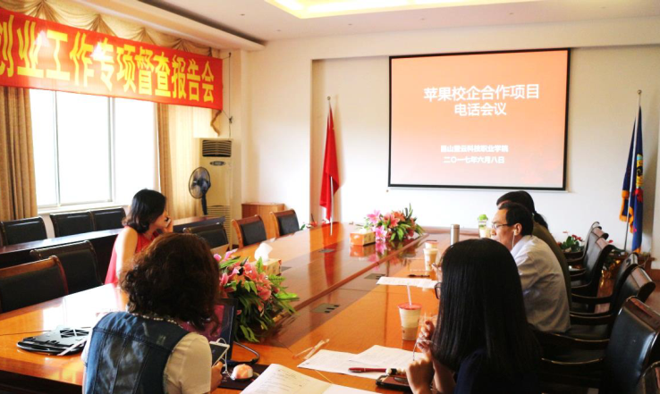 6月8日下午,我院在J2楼大会议室召开苹果公司校企合作项目电话会议。北京师范大学职业教育与成人教育研究所所长赵志群教授、苹果公司经理孙巍,我院院长助理陈长伟、信息系主任梁明、教务处副处长罗瑜及相关教研室主任参加会议。