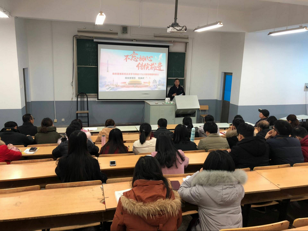 12月21日,商务管理系组织学习十九大精神宣讲会。商管系全体教师参会。商管系党总支副书记桂美庆担任本次宣讲会的主持人。