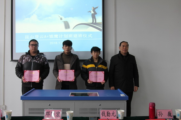 1月3日上午,我院“苹果A+雏鹰计划”建班仪式在机电一体化技术实训基地举行。钱勤元院长、陈长伟院长助理出席建班仪式。信息技术系梁明主任,机电工程系黄志辉主任,苹果公司孙巍经理,纬创资通昆山有限公司邓国宏副处长、徐建副处长,我院“苹果A+雏鹰计划”项目组成员、种子团队和“A+雏鹰计划纬创班”全体学生参加建班仪式。