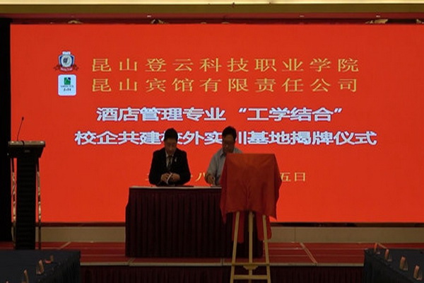 最后,王振州常务副院长代表学院与昆山宾馆签署了校企共建校外实训基地合作协议书,并与企业领导一起为“酒店管理专业校外实训基地”揭牌。