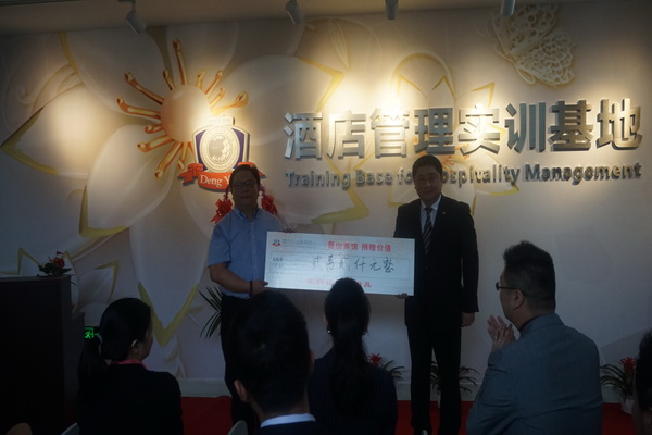 在企业捐赠仪式上,王振州常务副院长代表学院发言,他强调,酒店管理专业是我院重点建设专业、品牌示范专业,酒店管理专业校内实训基地的落成,标志着学院和企业产教深度融合迈上新台阶。