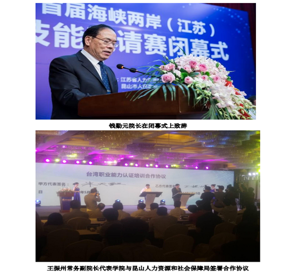 开幕式上张月林副书记代表昆山市政府致欢迎辞,台湾产经专家杜紫军、苏州市副市长曹后灵、省人社厅朱从明分别致辞。王振州常务副院长代表学院与昆山人力资源和社会保障局签署了台湾职业资格引进培训合作协议签约。