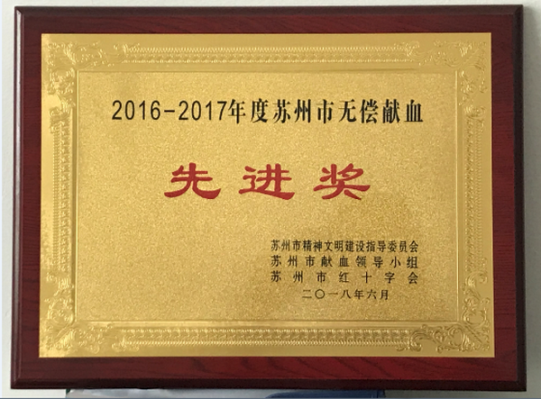 根据苏州市精神文明建设指导委员会、苏州市献血领导小组、苏州市红十字会联合下文的《关于表彰全市无偿献血先进的通知》,我院荣获苏州“2016-2017年度苏州市无偿献血先进奖”荣誉称号,这是主管部门对我院推进无偿献血工作的高度肯定。