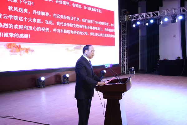 钱勤元院长为典礼致辞,他代表学院党政领导和全体教职员工向新生们的到来表示热烈的欢迎和衷心的祝贺。他指出,学院以两岸教育合作为优势,以工学结合专班为特色,以省级示范性高职院建设为抓手,以改革创新为动力,扎实推进教育教学改革,各项事业有了突破性进展。今年以来,学院圆满承办了首届海峡两岸(江苏)技能邀请赛,成功举办了“登云两岸产教融合协同育人研讨会”和“登云两岸产学合作联盟成立大会”,荣获了“江苏省平安校园建设示范高校”称号。学院力争到2020年,建设成为综合实力明显增强,人才培养水平显著提升,社会影响力更加广泛的海峡两岸文化教育深度合作的重要平台,服务区域产业转型升级技术支持的重要力量,培养区域经济社会发展急需人才的重要基地,符合教育现代化建设要求的特色鲜明的省级示范性高职院。他深切地希望同学们,不是做登云的“游客”,而是立志做登云的主人,让登云成为眺望世界、施展才华、成就自我的平台;不是做青春的“过客”,而是立志做自己的主人,正确认识自己,认识环境,确定合适的目标,制定可行的计划,努力完善自我;不是做时代的“看客”,而是立志做时代的主人,把人生梦想汇入时代洪流,让蓬勃青春与家国情怀同频共振。最后还叮嘱同学们多运动、少熬夜,不负芳华不负心,不负青春不负梦。