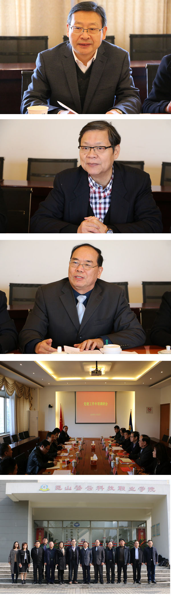 11月22日,江苏省委教育工委副书记徐子敏、组织处处长眭平、王峰,苏州市委教育工委委员沈宇,苏州市教育局组织处处长秦宁人、李定奖,昆山市教育工委副书记林文平等领导莅临我院开展党建工作专项调研。学院董事会执行董事李先立、党委书记院长钱勤元、党委副书记副院长徐伟、党委委员院长助理陈长伟及党委委员任启全、朱翠芳参加座谈会。