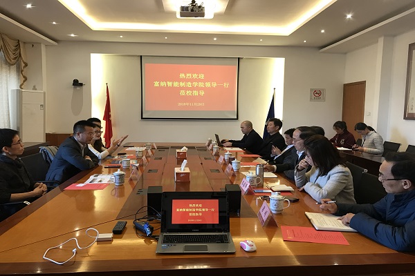 2018年11月29日下午,富纳智能制造学院院长单强、副院长郑永俊、培训总监张宝如,苏州富强科技有限公司高级经理孙青海一行4人莅校洽谈,受到我院董事会执行董事李先立、院长钱勤元、执行院长张进明、院长助理陈长伟热情接待,机电工程系、信息技术系、产学合作发展处等相关负责人参加会议。