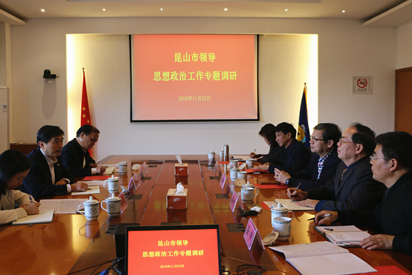 11月23日,昆山市委常委、昆山高新区党工委书记、管委会主任管凤良,市委教育工委副书记林文平、昆山高新区党政办副主任谈颂松等领导莅临我院开展思想政治工作专项调研。学院董事会执行董事李先立、党委书记院长钱勤元、执行院长张进明、党委副书记副院长徐伟、党委委员院长助理陈长伟参加座谈会。