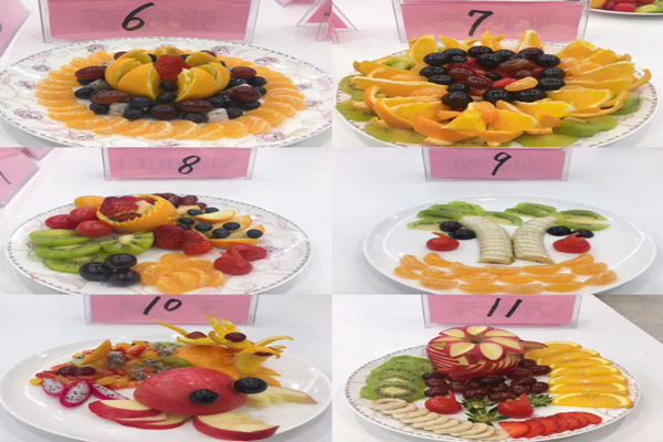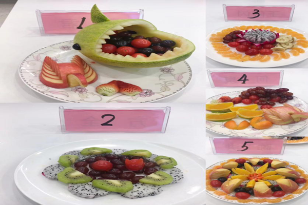 接着,以朱壮壮、薛游、贺国栋、马超群等为代表的11位选手为大家带来一场精彩的水果拼盘比赛。参赛选手利用盘子、水果特点进行构思、雕刻、拼接,完成作品,选手们丰富的想象力和独特的风格引来同学们的掌声,随后选手们用30秒钟介绍作品的题目和寓意,评委们对作品进行点评。在计分空隙,苟欢同学为大家带来一首《遇见》。