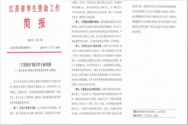 《江苏省学生资助工作简报》2019年第1期以“‘工学结合’助力学子成才路”为题,报道了我院创新资助育人情况。《简报》同时报送至教育部全国学生资助管理中心、各位厅领导,发送至省财政厅、厅有关处室以及全省高校。《简报》每年6期,此次报道对提升我院办学特色社会认可度和美誉度、促进招生就业、助力省级示范性院校验收等工作作用重大。