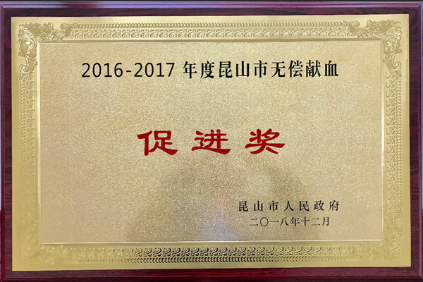 近日,我院被昆山市人民政府授予“2016-2017年度昆山市无偿献血促进奖”荣誉称号。