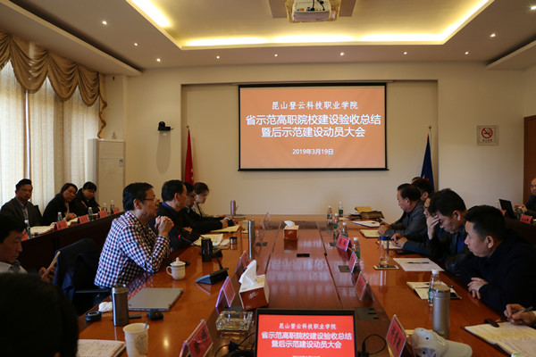 钱勤元院长对学院三年来示范校建设和验收进行了总结,通报了专家验收组对我院省示范性高职院校建设的验收意见。一是凝聚“政行企校”示范建设合力,超额完成任务书设定的建设任务。二是加强制度体系建设,增强合作办学活力。与昆山高新区共同组建了登云两岸产学合作联盟、创新中心,与合作单位成立纬创等企业学院,实现了体制机制创新突破。三是创新人才培养模式,提升人才培养质量。近三年来学生获奖成果颇丰,屡受社会好评。四是多措并举培养师资,加强师资队伍建设。提高教师教育教学科研能力,大力引进高层次人才。五是整合多方社会优质资源,依托两岸文化教育交流平台。增强服务社会能力。专家组一致认为,我院全面超额完成省示范建设任务。