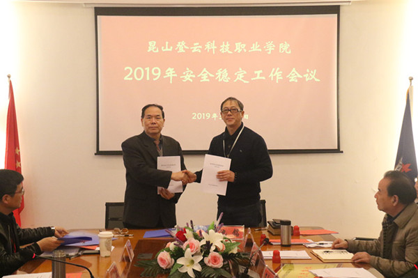 钱勤元院长为先进集体颁发奖牌并分别与各系部和各行政处室单位负责人签订了2019年安全稳定工作责任书和2019年消防安全工作责任书。