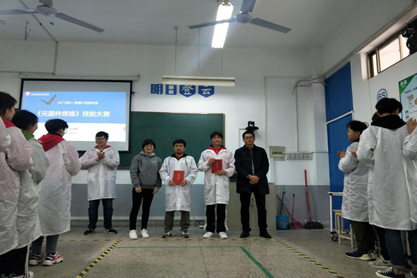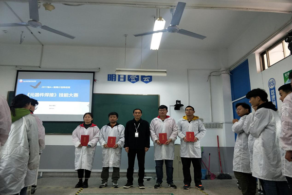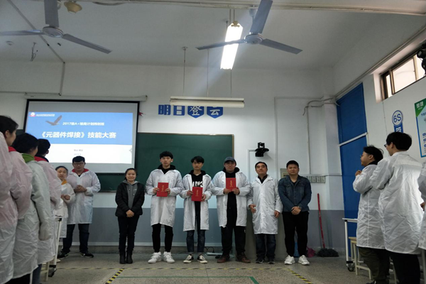 比赛开始前,同学们分小组汇报前期学习情况,王德山副理对元器件焊接标准和赛事指出要求。所有选手有序进入工位开始操作。1个小时的操作时间里,选手们加热烙铁、熔化焊锡、移开焊锡、移开烙铁,所有步骤都遵循教学标准有条不紊地进行。在规定时间内,所有选手都提交了焊接作品,评委们根据完成速度、点亮、美观等要点对作品进行打分。最终李杰同学荣获一等奖,张正、孙朗获得二等奖,黄涛、王磊磊、马傲获得三等奖。评委老师分别为获奖学生颁发了荣誉证书。