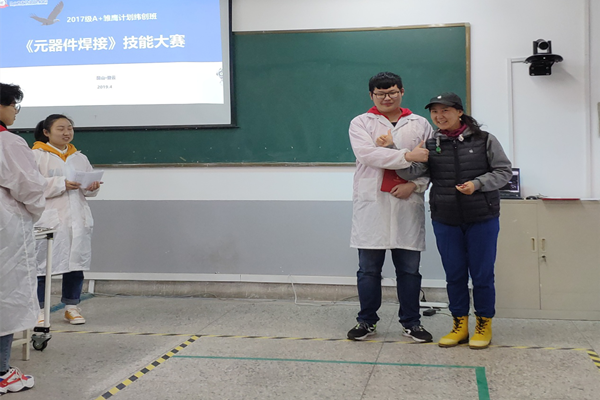 4月11日,我院A+雏鹰纬创班举行“元器件焊接”技能大赛,雏鹰班20名选手参加比赛。比赛特别邀请苹果公司赵燕经理,纬创资通(昆山)有限公司王德山副理、陈丽芳副理、夏明慧老师担任评委和颁奖嘉宾。