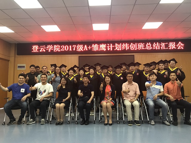 7月2日上午,2017级 A+雏鹰计划纬创班在雏鹰专班教室举行了“春华秋实·求真力行”期末总结汇报会,学院李先立执行董事,院领导张进明、徐伟、陈长伟亲临会场。质量管理处罗瑜处长,纬创资通李道华主任、秦峰主任、王小露副主任、李兆广副主任出席会议。