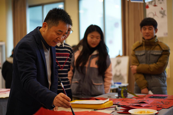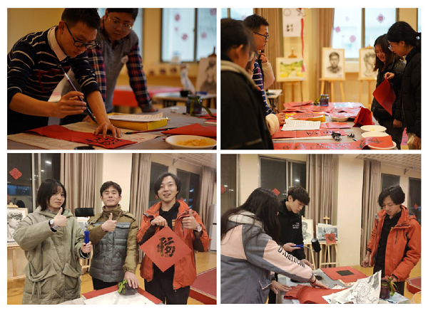 本次年终作品汇报展展出同学们创作的绘画、书法和摄影作品。活动中系领导、老师和同学们一起观摩了展出作品。系主任宋承裕亲自挥毫泼墨,书写春联,与师生共同拓平安“福”字,教室里其乐融融,师生共度新年。