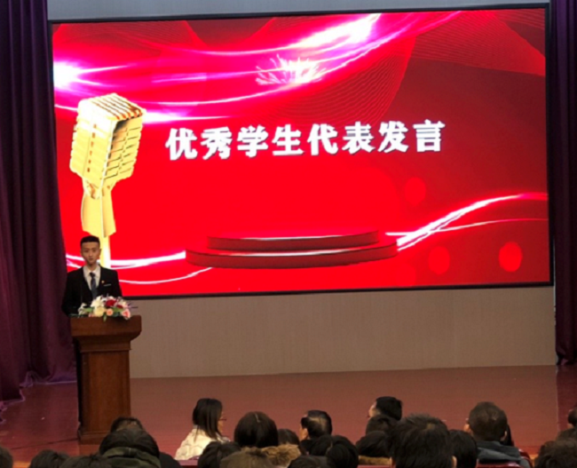 优秀学生代表张鸿志上台发言:他分享了自己的实习体会和学习心得,同时感谢学校和企业提供的锻炼平台,并表示要在今后的学习中勤学苦练,学以致用。
